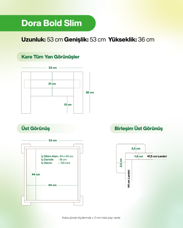 “Dora Bold Slim – 53×53 cm Alçak Kare Ahşap Saksı (18 cm İç Derinlik, Ayaklı)” için yorum yapan ilk kişi siz olun
