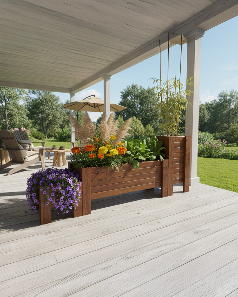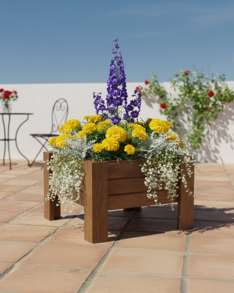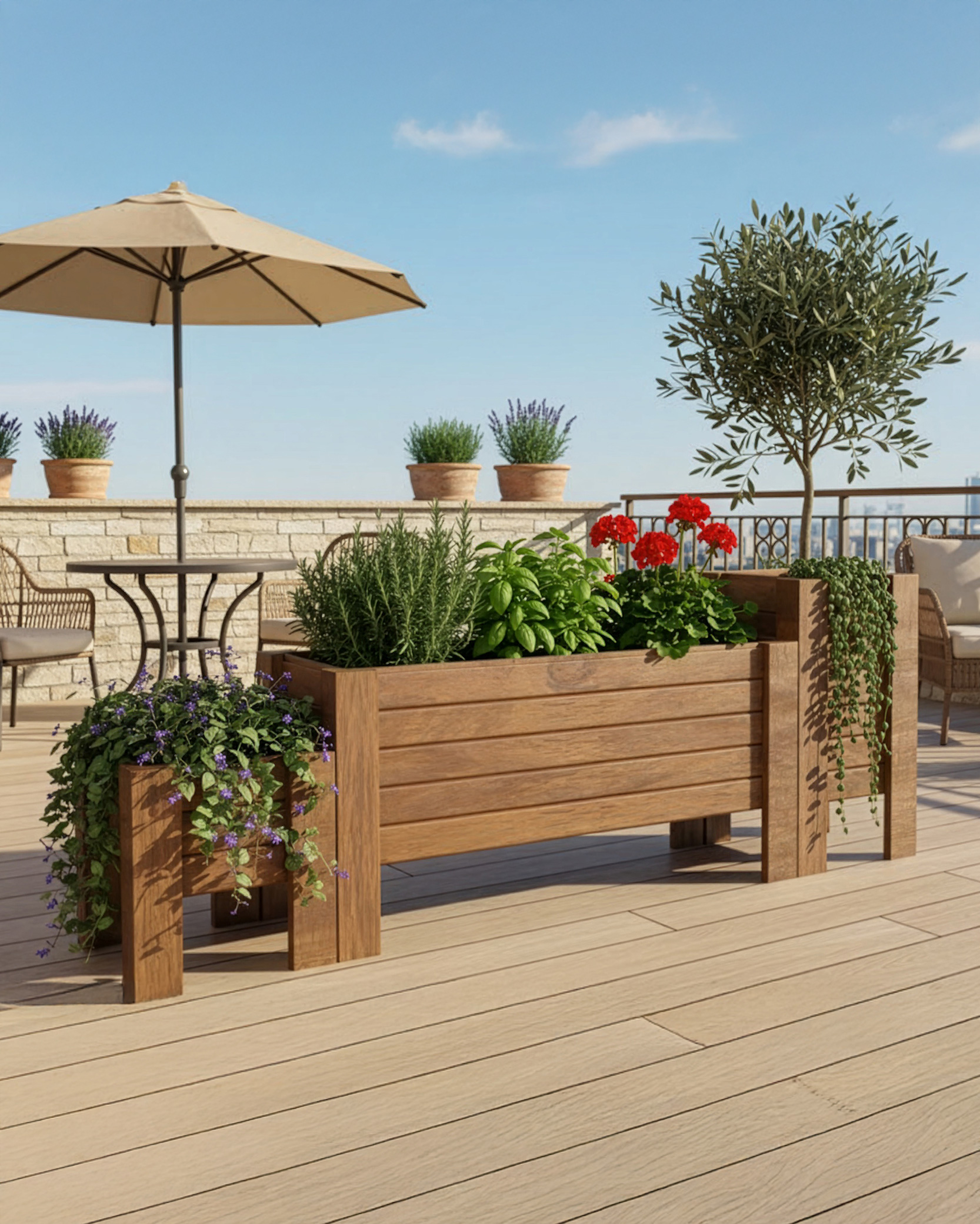 Geniş ve modern hatlarıyla mekanınıza derinlik katan Dora Long, özellikle balkon kenarları, teras duvarları ve mekan bölücü olarak kullanılmak üzere tasarlandı. 105 cm’lik ideal uzunluğu ile birden fazla bitkiyi yan yana sergileyerek zengin bir görsel şölen yaratır. Lambri geçmeli sağlam gövdesi ve yerden 15 cm yüksek ayak yapısı, hem temizliği kolaylaştırır hem de ahşabı zemindeki nemden korur.