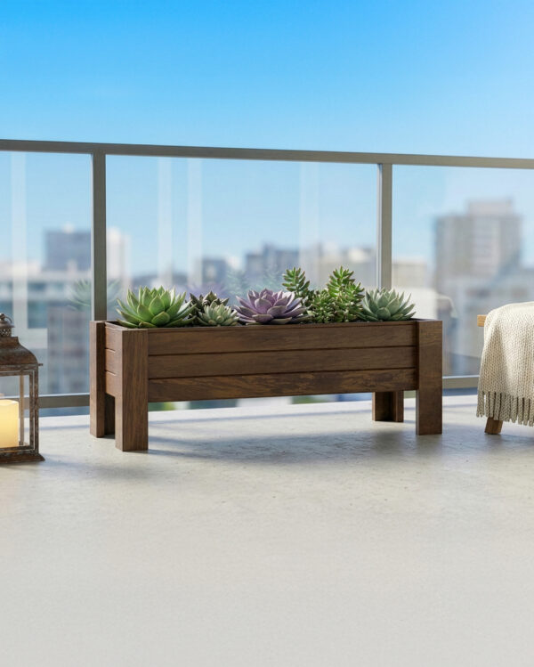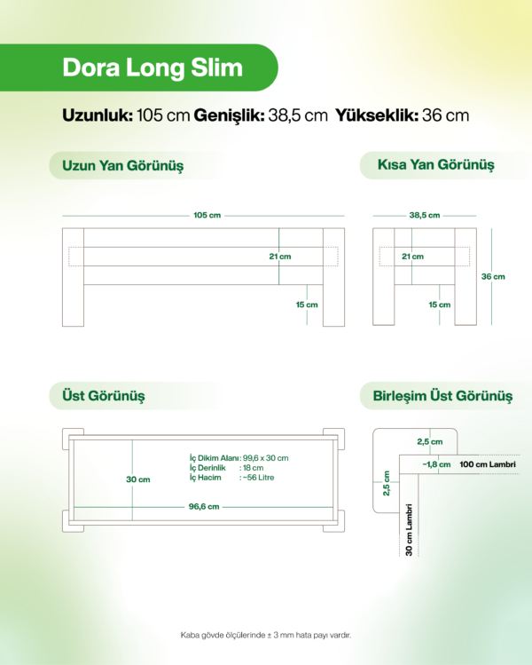 Geniş ve modern hatlarıyla mekanınıza derinlik katan Dora Long, özellikle balkon kenarları, teras duvarları ve mekan bölücü olarak kullanılmak üzere tasarlandı. 105 cm’lik ideal uzunluğu ile birden fazla bitkiyi yan yana sergileyerek zengin bir görsel şölen yaratır. Lambri geçmeli sağlam gövdesi ve yerden 15 cm yüksek ayak yapısı, hem temizliği kolaylaştırır hem de ahşabı zemindeki nemden korur.